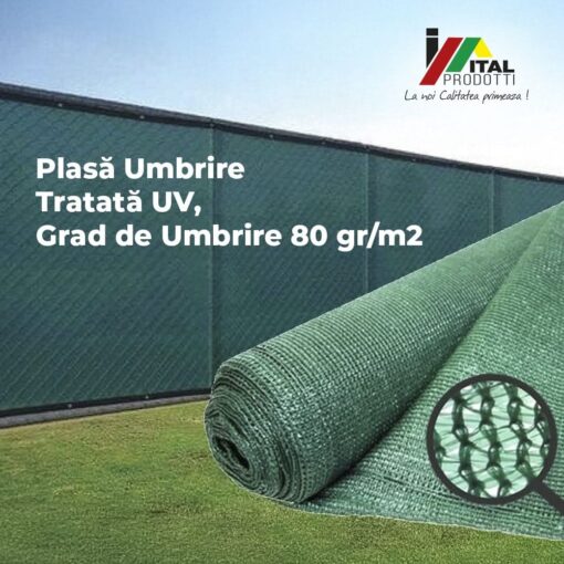 Plasa este confecționată din polietilenă de înaltă densitate (HDPE), tratată UV pentru a rezista în timp fără a se decolora sau degrada. Este un material flexibil, dar robust, ce rezistă la întindere, ploi și vânt moderat, fiind potrivit pentru utilizare de lungă durată.
